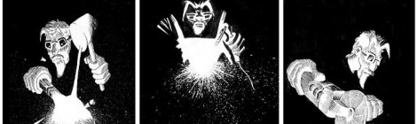 De dos, un homme devant une table, une dernière lettre, il monte sur sa chaise et se pend. Trois planches, dramatiques, silencieuses, servent d’introduction avant…