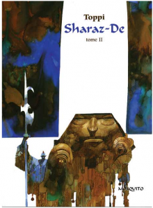 En 1979, il recueille l’unanimité de la critique lors de la publication de son album Sharaz-de, publié dans la revue Alter Alter. Composé d’histoires courtes contées à chaque nuit par la douce Sharaz-de, qui joue sa vie à chaque aube nouvelle. Comme un récit à tiroir, ces contes empruntent aux Milles et Une nuit mis en scène par des graphismes saisissants et orientalisants. Toppi livre ici une leçon de poésie et de technique alternant narration en noir et blanc ou en couleur directe. Le dessinateur surprend par la précision de ses traits hachurés qui empruntent à la gravure, révélant une virtuosité dans l’entrelacement des motifs et la profondeur sculpturale de son dessin. Le lecteur plonge dans un monde à la fois onirique et réaliste guidé par la composition des planches proprement spectaculaire. Les cadrages et les découpages dynamiques sont toujours ponctués par des phylactères ronds qui posent le texte en accord avec les formes de l’ensemble de la page. D’ailleurs Toppi ne se prive pas de pulvériser ses cases pour construire des agencements majestueux. Des totems fourmillant de détails nourris de références inspirés à partir des mythes et de ses interprétations. Dans sa maîtrise des tracés et des contrastes, Toppi s’impose à l’œil révélant son savoir faire majestueux.