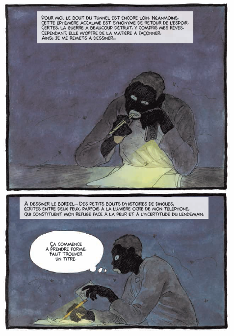 A feu et à sang, Tempête sur Bangui, se lit d’une traite. Embarqué dans une course à la survie, ce témoignage d’un civil dans la guerre prend jusqu’à l’écoeurement sur la pourriture du monde. Le dessinateur conclut « Pour moi le bout du tunnel est encore loin. Néanmoins, cette éphémère accalmie est synonyme de retour de l’espoir, certes, la guerre a beaucoup détruit, y compris mes rêves. Cependant, elle m’offre de la matière à façonner. Ainsi je me remets à dessiner… à dessiner le bordel… Des petits bouts d’histoires de dingues écrites entre deux feux, parfois à la lumière de mon téléphone, qui constituent mon refuge face à la peur et à l’incertitude du lendemain ».