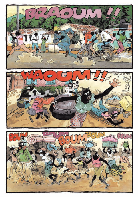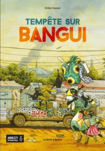 La France est engagée militairement en RCA depuis la mise en place de l’Opération Sangaris en décembre 2013 au terme d’une année de guerre civile particulièrement violente. Dans l’album Tempête sur Bangui, coédité en partenariat avec la Boite à Bulles et Amnesty International, le dessinateur Didier Kassaï fait le point en avant propos sur la situation de son pays, une situation décrite également dans la post face signée par l’ONG, qui résume la complexité de cette crise et appelle à la considération, à la réflexion, à l’aide et au désarmement. Le récit en bande dessinée s’illumine paradoxalement par les couleurs, les contours naïfs et l’humour tout en rendant palpables la terreur et les atrocités du quotidien.