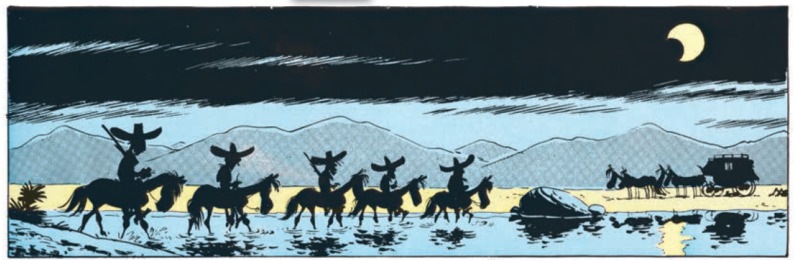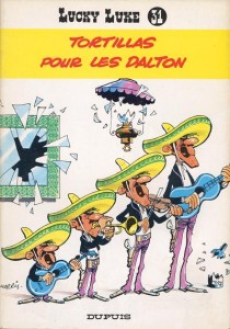 LuckyLuke31Caramba ! Premier voyage en terre mexicaine pour Lucky Luke. Tortillas pour les Dalton est sans conteste un des meilleurs albums de la série initiée en 1947 par Morris, très vite rejoint par René Goscinny. Les gags hilarants explorent tous les clichés du pays. Accompagné de son fidèle cheval, Jolly Jumper et du chien le plus bête du far-West Rantanplan, le légendaire “poor lonesome cowboy” part à la poursuite des Dalton, kidnappés par erreur par des bandits mexicains lors d’un transfert pénitencier et séquestrés de l’autre côté du Rio Grande, le fleuve qui marque la frontière naturelle entre les Etats-Unis et le Mexique. Décor désertique parsemé de cactus ou d’agaves, la plante qui sert à fabriquer la tequila, les saveurs piquantes des tamales ou autres frijoles, tout y passe, des combats de coqs aux mariachis, de l’inefficacité de la police à la sieste obligatoire. Rantanplan rencontre Rodriguez, un chihuahua minuscule d’une intelligence remarquable. La terreur locale Emilio Espuelas emprunte son look aux peones (paysans) mexicains stéréotypés dans l’imagerie de Speedy Gonzales, ”la souris la plus rapide de tout le Mexique”, coiffée d’un grand sombrero jaune avec un petit foulard rouge noué autour du cou. Clins d’oeil à Pancho Villa, le héros de la révolution de 1910, pour la moustache et la cartouchière en bandoulière. Le scénario épingle le retard économique du pays tandis que la caricature du propriétaire de l’hacienda rend flagrante les inégalités sociales dans ce petit village typique “qui porte courageusement le nom de Xochitecotzingo”.