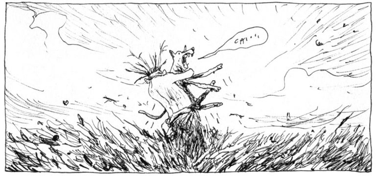 Gipi J’oppose surtout la sauvagerie à la barbarie, l’innocence des enfants à l’ignorance de la meute des fidèles du dieu Trocoul qui ont choisi délibérément d’obéir à l’Uberprêtre, une sorte de Mussolini actuel, manipulateur de foule. Il ne s’agit pas de justifier la violence, mais de dénoncer la société telle qu’elle est. Le père cherche d’abord par amour à protéger ses fils pour qu’ils survivent dans un monde cruel. La nostalgie pousse toujours les adultes d’une génération à regarder le présent sur le refrain du « c’était mieux avant ». Au contraire, je pense qu’en vieillissant on se fait dépasser par une réalité à laquelle les jeunes sont les mieux adaptés. L’erreur du père, c’est de penser qu’on peut éradiquer la tendresse. L’amour humanise.