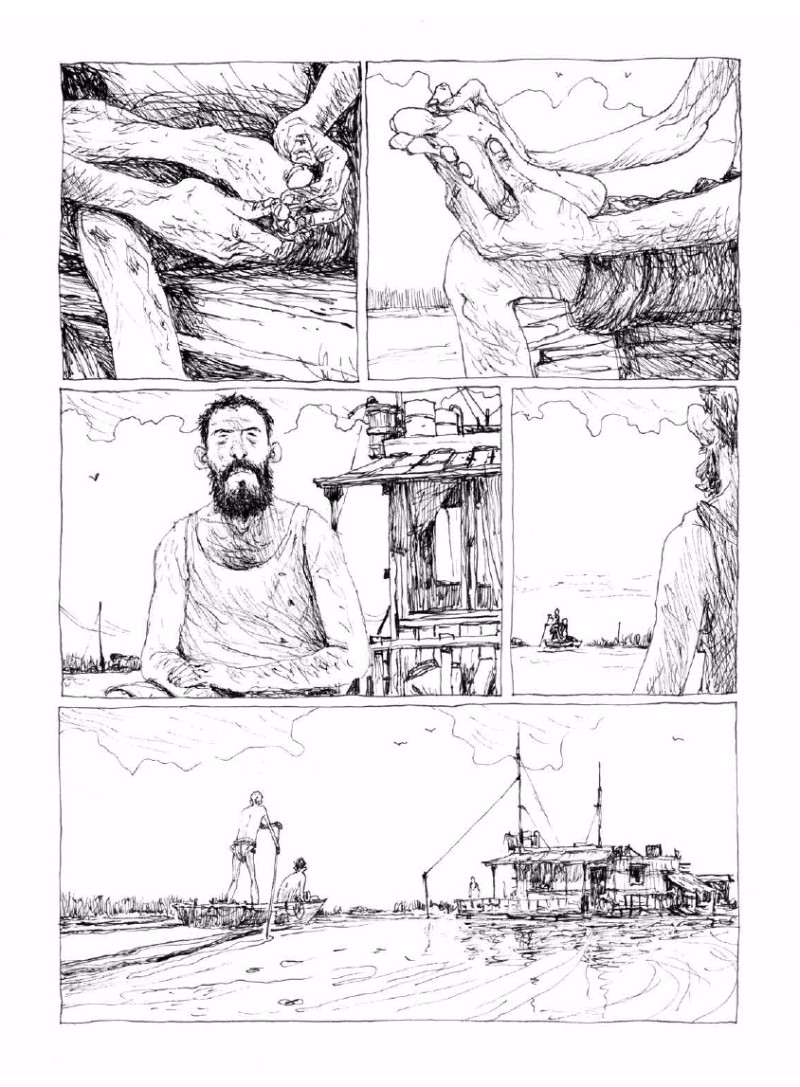 Gipi Je voulais vraiment sortir des récits autobiographiques dont j’ai l’habitude en écrivant une fiction. J’ai donc abandonné la voix off pour immerger directement le lecteur en laissant de la place à son imagination. Même si l’intrigue suggère l’apocalypse, chacun peut inventer les causes qui ont conduit au cataclysme : écologiques, sociales ou politiques. Personnellement, j’ai eu l’idée de ce décor en visionnant une vidéo populiste, qui imaginait l’extermination d’une majorité de l’humanité, obligeant l’autre à se cacher avant de resurgir vingt ans plus tard pour fonder la société parfaite. Pour moi, cette société parfaite c’est l’enfer, mais ce qui m’intéresse surtout, c’est cette relation d’un père qui écrit dans un carnet son amour pour ses enfants alors qu’il ne leur a pas appris à lire.