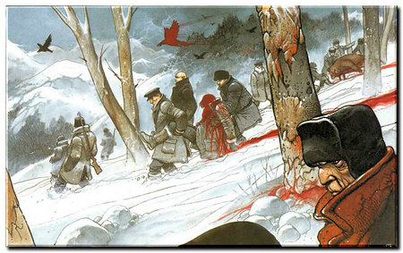 Loin des folies et des exubérances de Nikopol, Partie de chasse met en scène un attentat terroriste entre les apparatchiks du pouvoir soviétique camouflé en accident de chasse dans une datcha polonaise. “J’ai mis beaucoup plus de moi dans Partie de chasse – qui est vraiment, en ce qui me concerne, l’album du tournant”, explique Bilal. Le recours à la couleur directe sublime les envolées symboliques et fantastiques. Et si dans les deux premières planches, le dessinateur revient à la technique traditionnelle de l’encrage, dés qu’il s’agit d’évoquer le flash back de l’histoire de Tchevtchenko, le style explose, la couleur et le dessin deviennent moteurs de la narration. Christin et Bilal composent ensemble au fur et à mesure un double scénario textuel et graphique. Le dessinateur personnifie le cauchemar du monstre soviétique, il inonde de sang les bains de Budapest. Des giclées de peinture jaune ou rouge rehaussent les personnages dans un paysage laiteux et glacial transposant comme dans un songe ce thriller qui préfigure la chute du mur et propose une fable intemporelle sur les dérives du pouvoir. “Nous avions atteint avec Partie de chasse, une sorte d’apogée, il me fallait passer à autre chose”, affirme Enki Bilal. Le faucon de cette chasse reprend sa liberté et s’envole dans les dernières cases. Une image en clin d’œil à Horus, le Dieu faucon dissident de la trilogie Nikopol, reflet d’un artiste qui vole désormais de ses propres ailes.