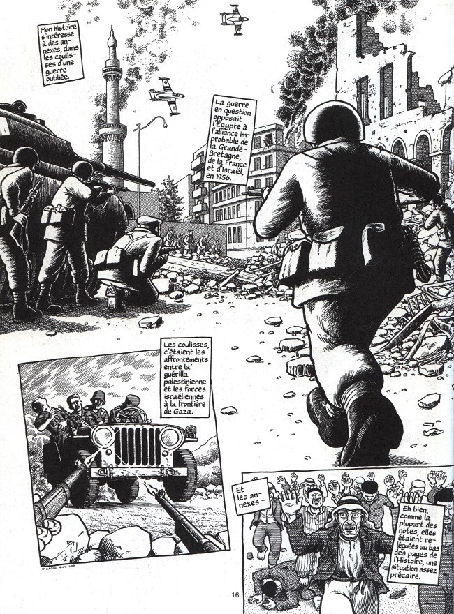 Après avoir dessiné la guerre en ex-Yougoslavie, il revient quinze ans après sur Gaza en interrogeant l’histoire, en décryptant cet événement singulier et terrible au cœur de la crise du canal de Suez, en confrontant les éléments par la vérification systématique des sources, avec cette manière d’interroger l’esprit critique du lecteur et d’opposer la distance de la réalité actuelle. Le massacre apparaît tragiquement anecdotique face à la succession des guerres et la violence de la situation vécue par les Gazaouis aujourd’hui.