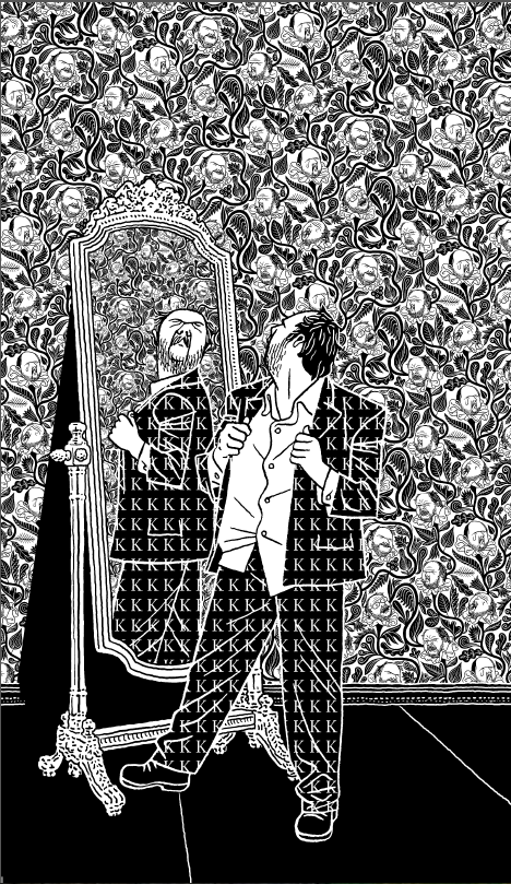Toutes ses variations relèvent ainsi de l’exercice de style. Et quel style ! En noir et blanc, le dessin de Killoffer subjugue par le trait, un trait précis et virtuose où la perturbation s’installe, dans une parfaite maitrise, harmonieusement troublée par les métamorphoses, et contrôlée dans le juste équilibre des dualités contraires. L’intensité balance au gré des rapports en négatifs, vibre dans les correspondances des contours, de la mise en scène des lettrages, de la superposition de tracés comme des réalités parallèles. Les décors se renversent, les fumées dispersent, et les motifs s’installent. L’image submerge. Le lecteur s’arrête, revient sur les pleines pages qui, sans leurs pendants scénarisés, semblent composer à elles seules un autre livre. Livre du silence, livre des mots. Les détails sidèrent et les rétines s’émerveillent face à la richesse de cet univers.