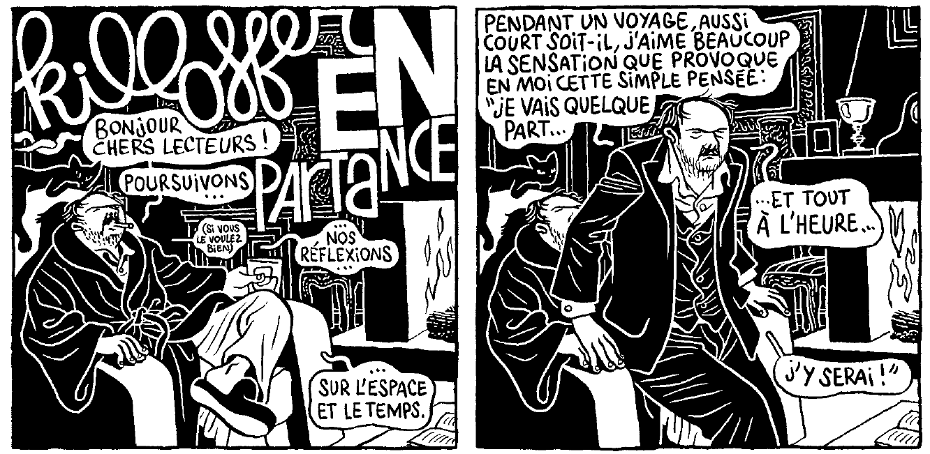 La chaussette défaite, la clope au bec, Killoffer en caleçon. Cendrier plein, bouteille vide, Killoffer en pyjama, en tenue d’Adam, en enfer, sur la lune. Killoffer se déguise, en aristo, en prolo, Killoffer en star, en panne, en cosmonaute, en poisson, en costard et en papier peint. La conversation s’enrichit des paradoxes que renferme cet être contradictoire, en déroute peut-être, en décalage certainement, mais un être qui procède d’un élan génial, et qui creuse sa recherche dans le potentiel des cases, des clins d’œil et des résonnances. Que peut le dessin ? Le professeur Killoffer semble répondre en bougeant des lignes et en tirant des traits. Par le processus de création, il trouve le moyen de marquer son emprise sur le temps qui passe. Le cours est magistral. Killoffer repart et dans une dernière image, il fait face, son sourire s’échappe en avant, traverse le chaos apocalyptique du monde. Sa personnalité d’artiste et d’homme rayonne en marche, en devenir, et en question.