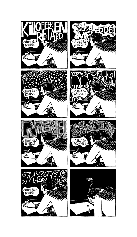 Un grand format en hauteur, une couverture souple pour une structure réglée. Une pleine page à gauche renvoie à droite sur une planche découpée en damier de 8 cases. La liberté opère en modulations graphiques inscrites dans cette mise en page invariable. A la manière des surréalistes, le cadre sert de contrainte nécessaire à la transgression des limites, et à ce jeu, Killoffer va loin, insatiable, jonglant avec talent, entre lui-même et son personnage, fluctuant entre sa verve et sa nonchalance naturelle, au point de donner une planche à dessiner à François Ayroles, pour partir en vacances.