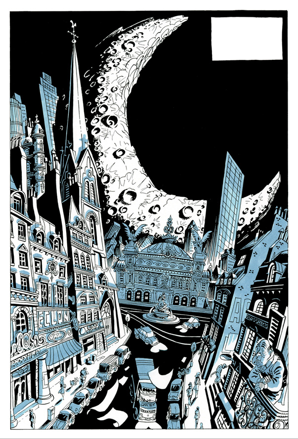 Cinéphile passionné et lecteur boulimique, Foerster nourrit son trait de détails aux inspirations multiples. Le découpage juxtapose des cadrages spectaculaires qui dramatisent encore l’angoisse de l’atmosphère. Dés la deuxième planche, après la catastrophe, en pleine page, le dessin immerge le lecteur dans un univers fantastique à la fois calme et menaçant. Le croissant de la lune est planté dans le lointain au milieu des ruines de la centrale nucléaire, les voitures roulent tranquillement sur une place qui ressemble à celle de l’Opéra Garnier, tandis qu’au premier plan, un homme fume au balcon manifestement indifférent aux feuilles blanches qui volent au vent. Les cases s’animent au gré des décors, des déformations, des architectures et révèlent une véritable cour des miracles, le grand cirque des bêtes humaines et des monstres mutants. De Kafka à Philip K. Dick, du fantastique à la science fiction, de la littérature au cinéma, Foerster feuillète le thème universel des monstres qui lui sont chers, plongeant à l’instar des plus grands mythes, dans la traduction de l’envers de l’âme humaine, démontrant la face cachée de la lune, la monstruosité en miroir. C’est le message des terribles pieds de nez qui se jouent dans le dénouement tragique de chaque récit, une ironie salée par l’humour du désespoir.