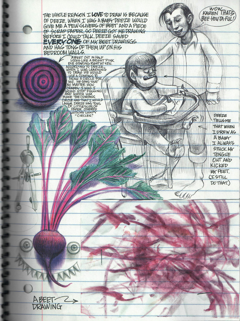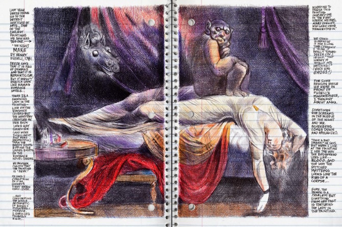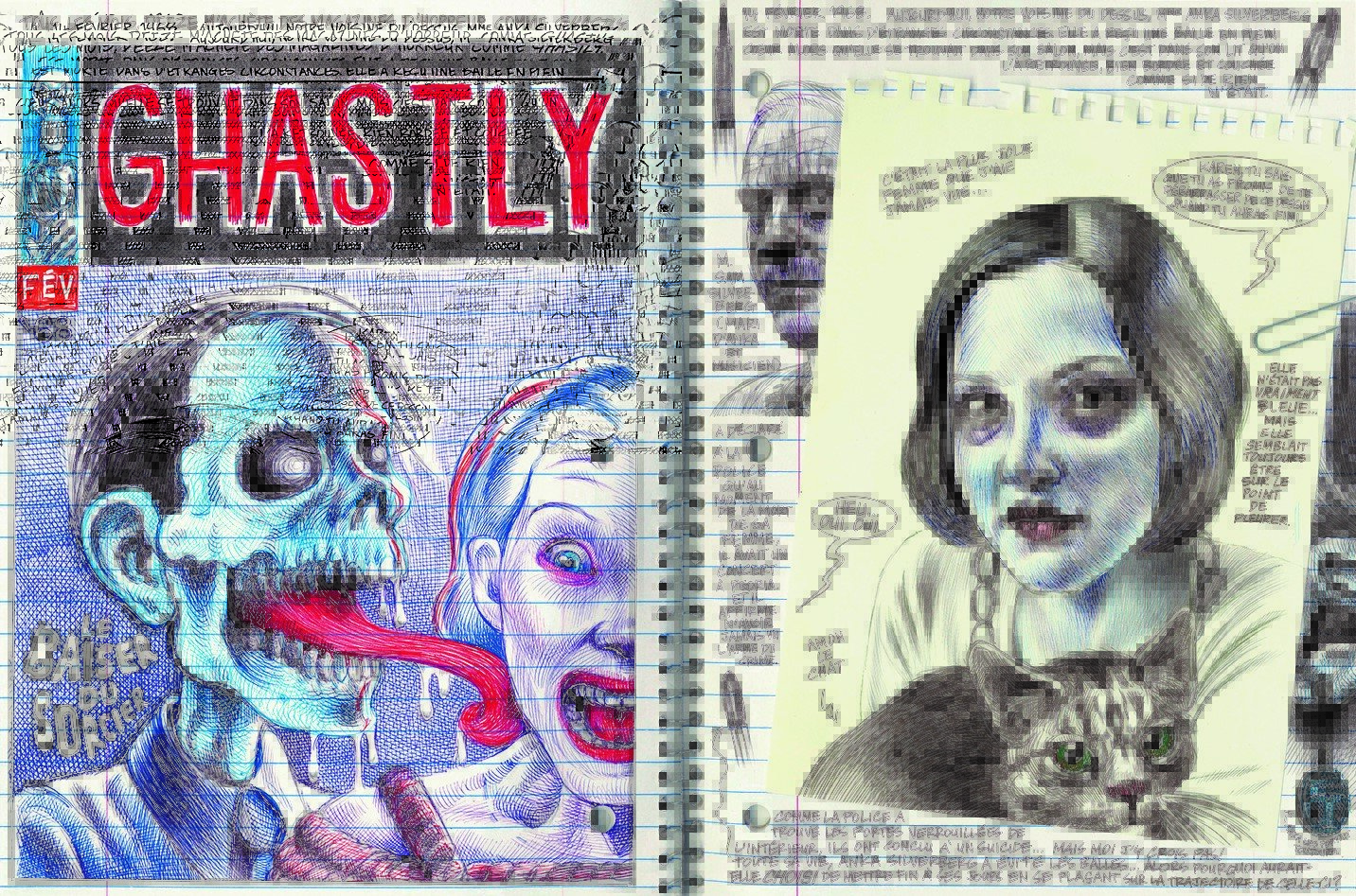 Born to draw, c’est ce qui est écrit en tatouage sur le torse de Deeze, ce grand frère adoré et gigolo, un croisement entre Diego Rivera et Emiliano Zapata. Apôtre du surréalisme, c’est lui qui initie Karen au dessin avec du jus de betterave, qui lui fait lire MAD et les bd de Crumb, qui l’emmène au musée, son lieu favori, le Chicago Art Insitute, où Emil Ferris a repris ses études après la maladie. Née d’un couple d’artistes, la dessinatrice a baigné dans l’art toute son enfance : « Pour Deeze le meilleur moyen de trouver son chemin dans les mauvaises passes c’est de les dessiner. » écrit Karen et c’est vrai aussi pour Emil Ferris qui parsème son livre d’anecdotes nourries par ses expériences. La construction du regard par l’art, l’importance accordée à la culture, la défense de l’imaginaire en agent d’émancipation sont sans doute les plus fortes revendications autobiographiques : « le décor mental de Karen est très proche du mien quand j’étais petite.» souligne-t-elle. Les leçons sur la typographie, les théories sur le nombre d’or, le rôle des triangles sur la composition d’un tableau ou encore le « Vesica piscis, le motif de la création », toutes ces idées transmises par Deeze forment un système de représentation à l’œuvre dans le journal de Karen, dans la mise en page de chaque planche. Prise au jeu de ces emboîtements, la narration ne cesse de créer reflets et résonances, alors que Karen développe un style expressionniste inspiré par George Grosz ou Otto Dix, en piégeant la grimace sociale de leurs caricatures, en fusionnant ses deux passions pour l’art en général et la bande dessinée en particulier. Dans les tableaux, Karen se raconte des histoires, démasque les monstres et perce les mystères de la perspective, de l’illusion des natures mortes et de la décomposition de la touche impressionniste par le pointillisme de Seurat, qu’elle applique elle-même à sa technique en vibration de traits en couleurs, qui produit ce modelé pictural presque vivant. Au Musée, elle cuisine son esprit, prépare « une soupe à l’indice » dans laquelle elle trouve les ingrédients à l’intuition. « Il ne faut pas se contenter de regarder les tableaux, mais les entendre, sentir, goûter, toucher », prévient-elle. En lisant des comics, devant les films comme Le Loup garou ou Le Carnaval des âmes, elle acquiert la méthode : les twists des thrillers, la force des effets d’annonces, les scènes d’escalier et le recours au Mcguffin.