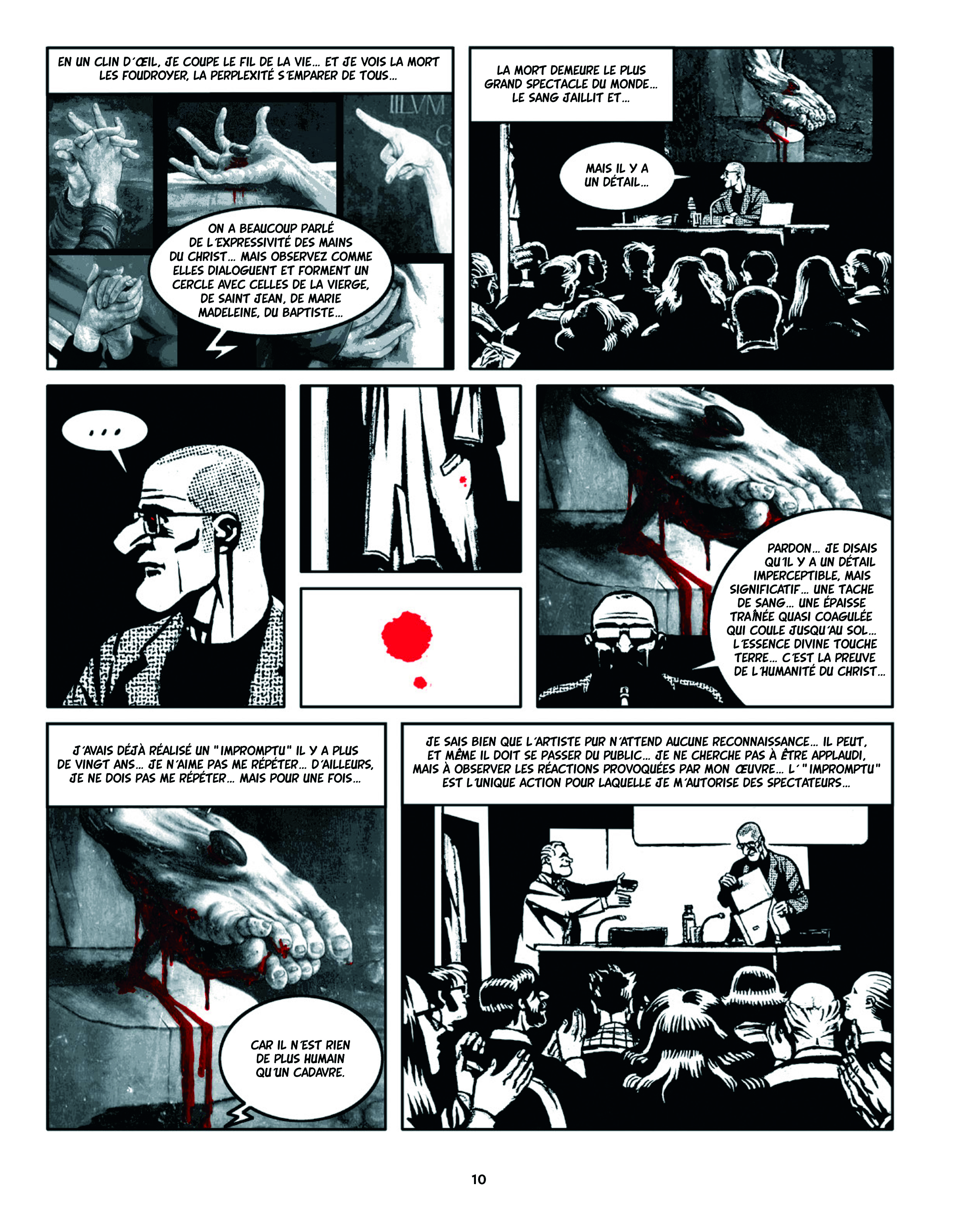 L’art comme la BD est exagération, transgression, il puise au cœur du mal pour dénoncer, terrifier, rendre compte de pulsions. Accusé d’un meurtre qu’il n’a pas commis, le tueur en série se défend par le sublime. Une plaidoirie a priori absurde qui met en perspective le meurtre gratuit, mais qui retourne la problématique, comme en psychanalyse, en impliquant la complicité du lecteur, et en reprenant l’idée que nous sommes tous des assassins en puissance.
