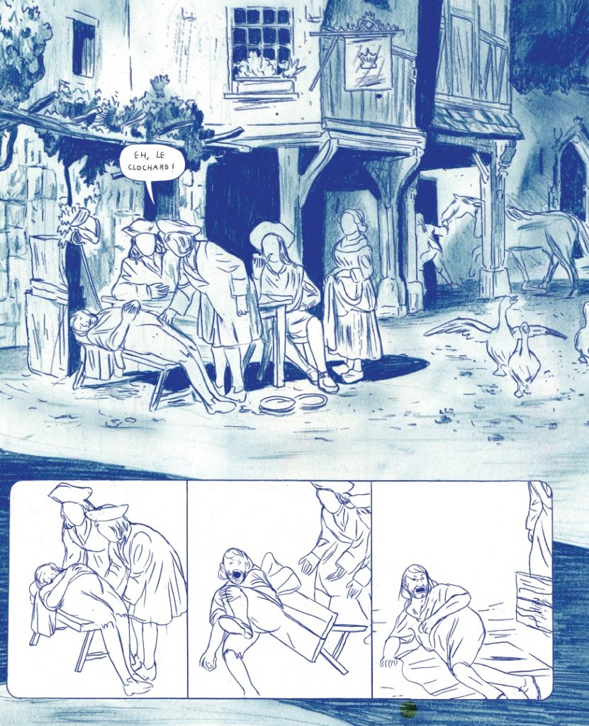 F. R. : Avant de faire un dessin, nous travaillons beaucoup en amont pour fixer le découpage, mettre en place les points de vue, décider des perspectives. Mais une fois que le dessin est terminé, il est « prêt à encadrer ». Nous sommes des perfectionnistes du trait, toujours pointilleux sur la bonne résolution des lignes et Olivier nous a fait travailler en 300 dpi ! Pour ce livre, nous avions fait des repérages à Bruges et ramené beaucoup de décors. Je me souviens d’une superbe vue de la ville tout en détails. Olivier prend notre dessin, le badigeonne de gouache. Il crée un énorme contre-jour si bien que notre image disparaît : on distingue à peine les silhouettes de l’architecture et plus aucun des petits traits si minutieusement ouvragés. Entre nous, et ensuite avec Bastien, nous avons toujours fonctionné en prenant garde à ne pas piétiner le travail de l’autre, à bien faire attention que la collaboration soit une addition d’intérêts et de sensibilités. Olivier est un pirate. Il ne fait pas que nous marcher sur les pieds, il nous danse dessus, sans se soucier qu’on soit allongés par terre. Pourtant, Portrait d’un buveur est sans doute notre meilleur album d’un point de vue d’auteur, le plus ambitieux, parce qu’il est truffé de mille subtilités qu’on a finalement réussi à mettre en œuvre.