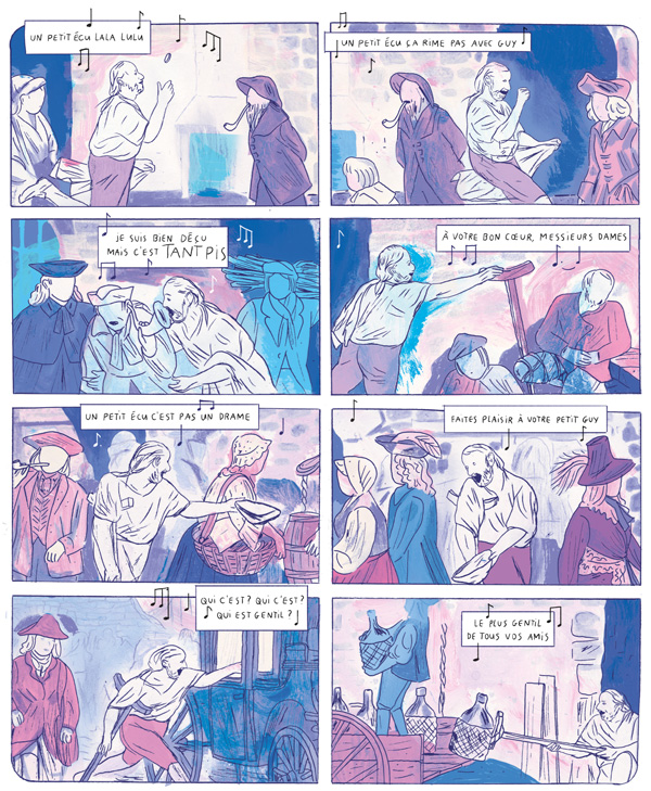 J. M. : L’imaginaire des pirates impose des contraintes et détermine tout un travail préparatoire pour donner de la crédibilité au récit. Qui ? Sur quel bateau ? Pour aller où ? L’intrigue se construit autour de questions concrètes afin de bâtir l’espace graphique et imaginaire, faire circuler le personnage et la narration dans les cases. La documentation permet ainsi de plonger dans des univers auxquels on n’aurait jamais eu accès. Pour notre histoire, l’Europe du Nord constituait un point de départ idéal. Rien que le titre Portrait d’un buveur fait référence à un motif célèbre propre à la peinture flamande. On pense tout de suite à Rembrandt, à Frans Hals, aux peintres du Rijksmuseum d’Amsterdam comme aux scènes de village de Brueghel et à toute la peinture hollandaise de genre, une mine inestimable d’instantanés réalistes de l’époque. Dans les scènes de taverne, des buveurs au gros ventre avec les yeux qui brillent montent sur des tonneaux, pissent et vomissent dans les coins. Le trivial et le paillard poussent parfois jusqu’au grotesque.