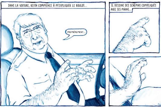 Entre un phare cassé et une crise d’eczéma, la rupture est consommée. Reste au-delà de l’incompréhension et de l’incompatibilité flagrante, la solitude en partage et une relation qui se construit malgré tout, au-delà de cette distance symbolique, à travers la cohabitation forcée dans l’habitacle entre le sexagénaire donneur de leçon et le jeune homme à fleur de peau. Peu à peu, au fil des pages, sonne la musicalité d’un train train avec  les friands du midi, les remarques salaces de la boulangère, Kenny, l’idiot du village, les pauses clope avec Val, la réceptionniste sympa, le doigt paternaliste et inquisiteur de Keith. Dans cette petite ville morne, tout le monde se connaît et se retrouve lors de la réunion rôtisserie bimensuelle et les si prévisibles anniversaires surprises. Les portraits martelés dans les cases fixent un regard, une pose, un plan raccord sur une main ou le trou d’une narine, télescopés par la perception et les projections mentales de Sam qui raconte. Avec un sens aigu de l’observation, Joff Winterhart nourrit le réalisme d’effets de juxtapositions et  de répétitions.
