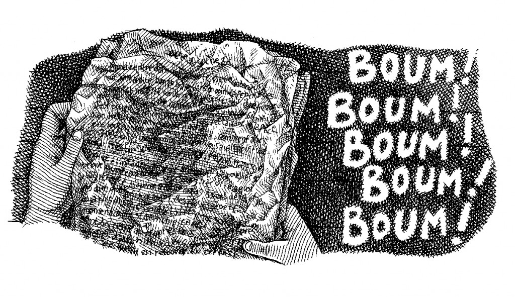 Chut ! ça commence ! Boum. Boum. Boum. Quoi ? La nuit. J’ouvre le nouveau livre de Rachel Deville. Une case noircie et flottante grossit de page en page, c’est la case « obscurité », l’ombre nécessaire pour voir. Je suis au théâtre, en quelques pages, l’irréel m’emporte, un refrain étrange de vérité, une matière discontinue, une narration de récits suspendus qui avancent inexorablement et qui disent ou traduisent l’insaisissable rêvé. « Tout est très confus… s’agit-il de la « réalité » ou d’une pure représentation théâtrale ? Si oui il s’agit là d’une sacrée performance et ce metteur en scène a vraiment du génie. » Rachel Deville semble parler d’elle-même. Elle est ce metteur en scène de génie, ou plutôt une architecte si à l’aise avec la logique onirique, qu’elle reconstruit le rêve au plus près de sa réalité. Dans un formidable travail de remémoration, la fidélité prélude à toute retranscription. « Rachel Deville, amoureuse du réel, chapeau bas ! Rachel Deville : une vraie dure », conclut le psychanalyste Hervé Castanet dans une belle préface. Oui, Rachel Deville est une dure, dans l’âpreté de ses images, dans la sincérité surtout des séquences où la bande dessinée s’impose comme l’évidence de l’expression onirique. C’est ce qui rend les planches impressionnantes de justesse, au travers des séquences dessinées et de cette voix off, fil conducteur de la subjectivité qui réunit les rêves. Car Rachel rêve de Rachel, et tout dans le rêve, est Rachel.