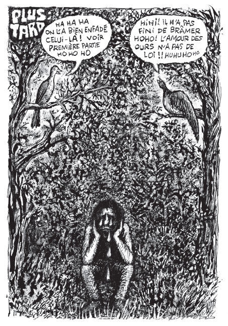 Ce premier épisode, de la séparation à la naissance de Jean de l’Ours, focalise sur l’illusion et les mystères de l’amour, matérialisés par les champignons qui rendent Malvina amoureuse de l’animal, de la même manière que les sorcières séduisent Christophe avec des philtres dans la forêt. La drogue sert de leitmotiv pour ouvrir la perception de l’imaginaire, pour explorer la bestialité de l’être humain. Il en sera de même pour l’initiation de l’enfant dans le second tome où la châsse à l’ours témoigne de la brutalité du passage à l’âge adulte, à travers le rejet et la marginalisation.