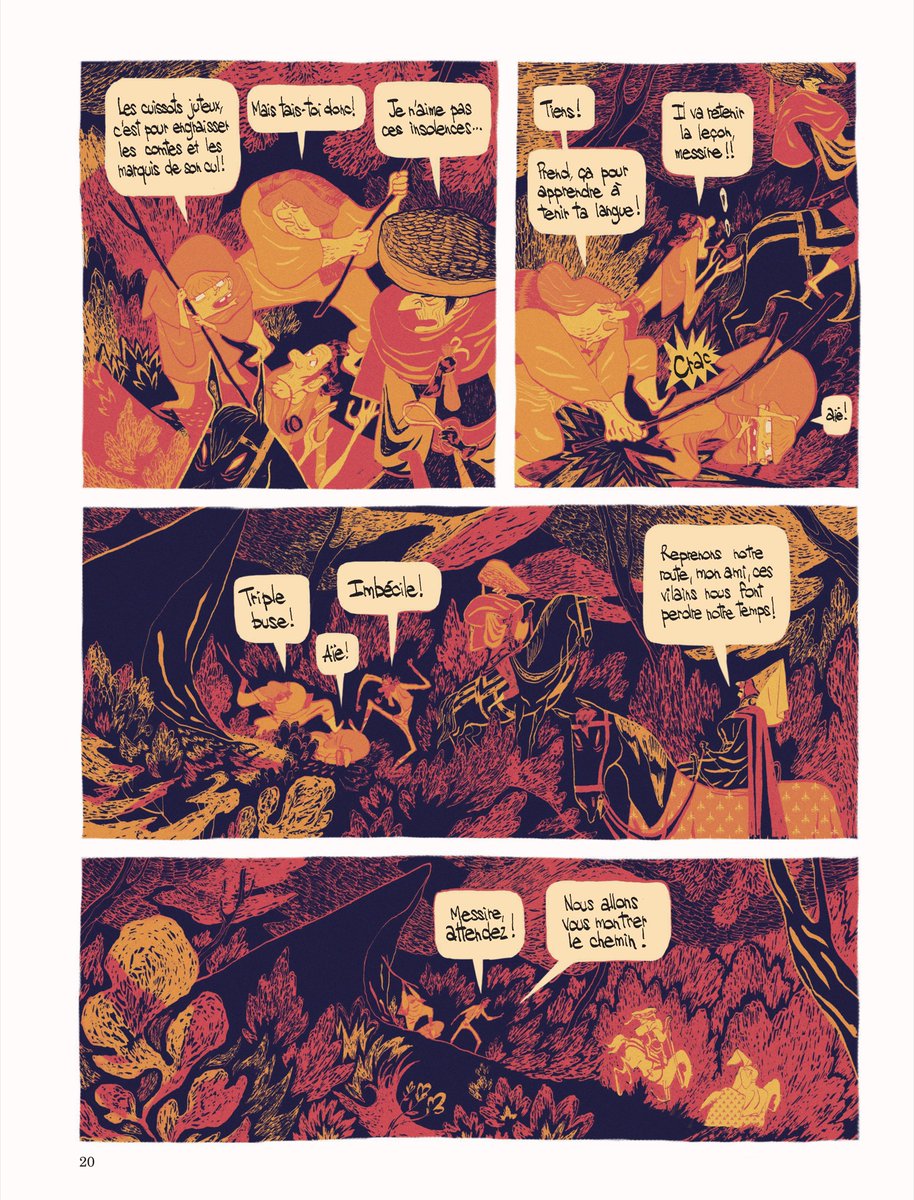 Dans un vocabulaire graphique et une construction inspirée par l’esthétique médiévale, le trait animé par un découpage épique vire parfois à l’abstrait. « C’est toujours compliqué d’ajuster son graphisme à l’histoire. Roxanne m’a bien aidé. Je me suis imprégné de toute l’imagerie de la fin du Moyen Âge, juste avant la Renaissance et l’apparition de la perspective, en jouant sur les mises à plat dans l’image de certains éléments et surtout en reprenant les répétitions de personnages dans la même image, un procédé narratif très commun pour l’époque, propre à toute cette communication visuelle destinée à un peuple qui ne sait pas lire, par exemple dans les retables ou les vitraux », ajoute-t-il. L’artifice campe le récit dans un univers médiéval, tout en permettant un découpage classique et régulier des planches sur trois bandes jamais plus resserrées qu’un damier de six cases. Une manière aussi de mixer les procédés entre les emprunts médiévaux et l’espace en perspective reconstruit dans les cases, dans un ensemble presque storyboardé qui multiplie les effets cinématographiques de champ-contrechamp, de plans panoramiques en plans larges, de plans resserrés en gros plans. C’est le secret du bon dosage dans une alchimie des images qui projette cette épopée en cinémascope. Roxanne témoigne : « Cyril avait dessiné trente pages qu’il a recommencées entièrement. Au départ il avait pris le parti de travailler au crayon, ça donnait un rendu vraiment « disneyen » très beau et assez rond, mais qui n’allait pas dans le registre. Il fallait rajouter un peu de bizarrerie. » Et pourtant Disney reste en filigrane de cette bande dessinée composée comme un grand spectacle pour plaire à tous. Cyril conclut : « On voulait vraiment favoriser le plaisir de lecture, surtout ne pas faire quelque chose de théorique. C’est l’action qui raconte, qui démontre. Sans forcément convaincre le lecteur, on souhaite toucher le plus de monde possible ! » C’est tout le charme de cette utopie.