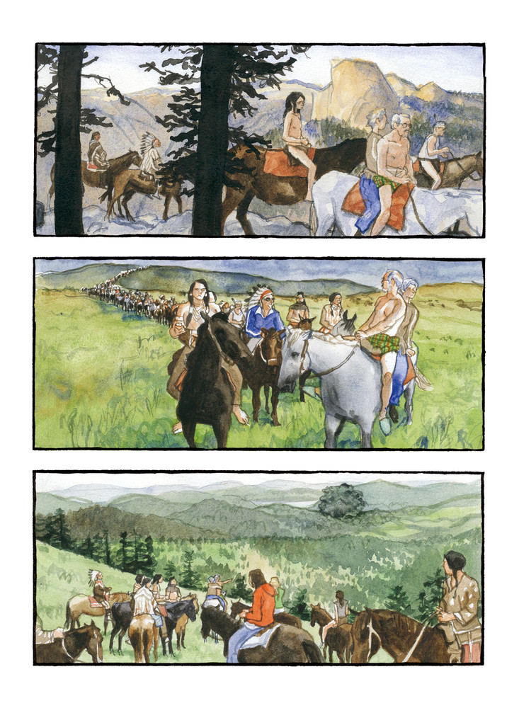 Quand on ouvre la boîte, la famille sort au grand complet avec tout l’attirail qui sert à évoquer son univers. Les bisons traversent le salon. Les chercheurs d’or attaquent à la dynamite les canalisations de l’évier de la cuisine. Le récit s’adapte naturellement aux artifices de la narration. Sous la forme d’un journal de bord, on suit la transformation du salon en plaine du Wyoming, en parcourant des kilomètres d’une planche à l’autre. «L’appartement subit une telle expansion.» On établit une carte du pays, il faut trois jours de marche pour se brosser les dents. Les images défilent, déroulant l’épopée héroïque d’un western actuel, où les Indiens continuent de courir pour échapper à l’avis d’expulsion et aux services de l’immigration qui traquent les sans-papiers. Des cow-boys en costard.