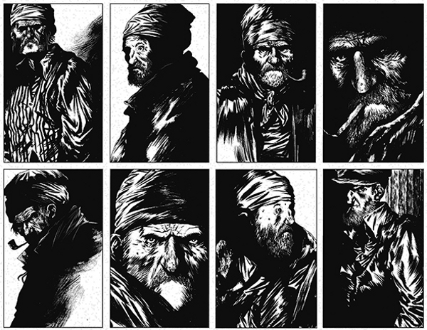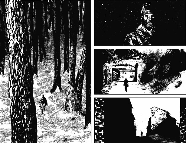 Par ses figures de style graphiques, ses planches naturalistes et ses découpages impeccables, Larcenet se fait interprète. Il recrée ses concordances et ses échos visuels, souligne les contrastes et accentue les tensions duales à l’œuvre dans le roman. La noirceur s’immisce par l’encre de chine, s’approprie la matérialité symbolique de la neige et absorbe la lumière dans l’intensité des ombres. En noir et blanc, le dessinateur ajuste un trait réaliste qui ne triche pas, un dessin pour tout dire, même l’invisible et l’indicible, comme un coup de chapeau à Rembrandt et au clair-obscur, au vecteur de l’art dans la quête d’absolu et de vérité.