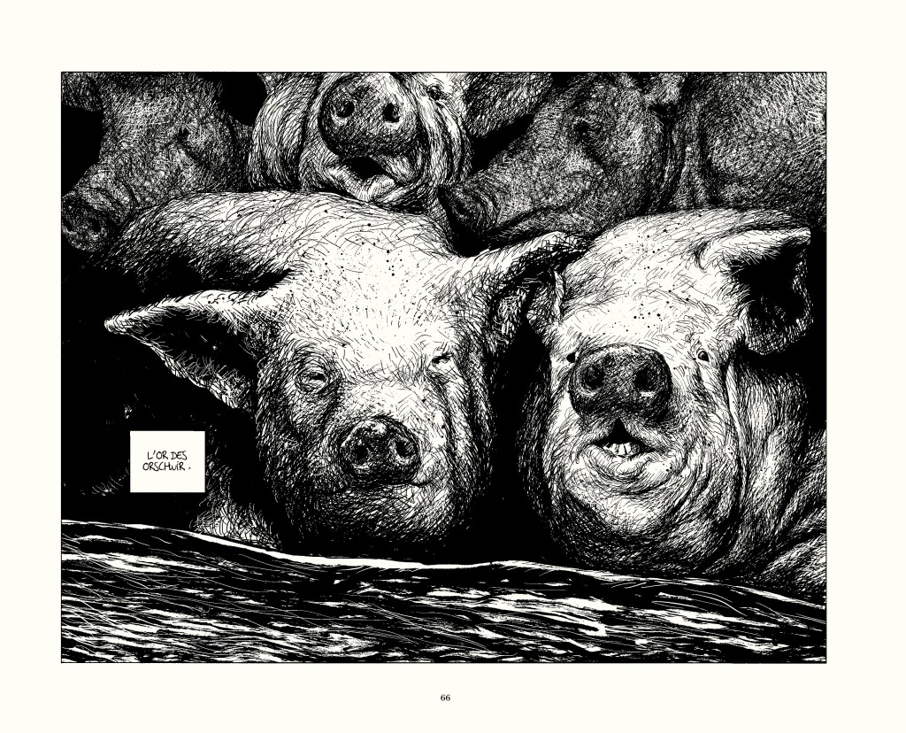 Les mots du roman, pourtant, Larcenet les a gardés tels quels, ou presque, fidèle à la matière originale, empruntant à l’intérieur du livre des citations entières qu’il embarque dans ses bulles narratives carrées comme dans les dialogues qu’il met en scène. Il condense parfois quelques images, aménage l’intrigue en supprimant quelques épisodes et souvenirs, ceux de la ville notamment, en fusionnant certains personnages et certains lieux, pour accentuer la tension dramatique et reconstituer au cœur du village, le huis clos qui se joue dans la tête de Brodeck, sa rébellion et son émancipation par le souvenir. (Je regrette juste à titre personnel la suppression du chien errant Ohnmeist).